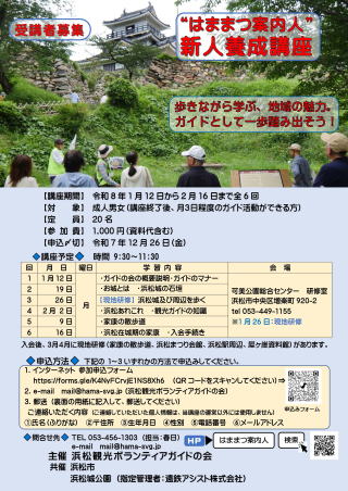 第2回 犀ヶ崖資料館 10周年記念ウォーク ⇒受付は終了しました。浜松城近くの家康公ゆかりの史跡を、伝承話を交えたガイドの解説を聞きながらめぐり、戦国時代の浜松に想いをはせるウォーキング 「三方ヶ原の戦い」の元亀3年12月22日にちなんで、前日(21日)に開催! 【日時】2025年12月21日(日)9時00分~(集合:8時45分) *小雨決行、荒天の場合は中止 【集合】浜松城公園スターバックス北側 (せせらぎの池付近) 【コース】浜松城公園⇒亀山トンネル⇒犀ヶ崖資料館⇒真向坂⇒ 火ともし山(※推定地)⇒浜松八幡宮⇒椿姫観音⇒元城町東照宮 ⇒ 浜松城公園(解散) 約2.5時間 ※三方ヶ原の戦いの夜、かがり火を焚いて敵襲を防いだと言われる伝承地 【定 員】25名 (先着順) 【参加費】無 料 【駐車場】浜松城公園駐車場は有料(90分まで無料) 【案内人】浜松観光ボランティアガイドの会 会員 【持ち物】水分補給用の飲み物 【申込み方法】 ⇒受付は終了しました。 ◇期間 11月5日(水)9:00~12月10日(水)17:00 (注)期間途中でも、定員に達した場合は受付を終了いたします。 ◇方法 A:インターネット または B:電話 A:インターネットによる申込み 申込みQRコード⇒⇒ B:電話による申込み (または問合わせ先) 犀ヶ崖資料館 (月曜日:休館、但し11月24日は振替休日のため25日が休館) 053-472-8383 (受付時間 9:30~16:30) 主催:浜松観光ボランティアガイドの会 後援:浜松市、(公財)浜松・浜名湖ツーリズムビューロー “はままつ案内人” 新人養成講座 受講者募集 ![]() 歩きながら学ぶ、地域の魅力。 ガイドとして一歩踏み出そう! 【講座期間】令和8年1月12日から令和8年2月16日まで [毎月曜日全6回]9:30~12:00 【講師】浜松観光ボランティアガイドの会・会員 【対象】成人男女 (講座終了後、月3日程度のガイド活動ができる方) 【定員】20名 【参加費】1,000円(資料代含む) 【講座会場】座学研修:可美公園総合センター研修室 現地研修:浜松城周辺 【申込方法】①~③のいずれかの方法で申込みしてください。 1)インターネット 参加申込フォーム リンクはこちら https://forms.gle/K4NyFCrvjE1NS8Xh6 2)e-mail mail@hama-svg.jp (浜松観光ボランティアガイドの会) 3)郵送 (チラシ裏面の用紙に記入して、郵送してください) ご連絡いただく内容 (ご連絡していただいた個人情報は、当講座の運営以外には使用しません) ①氏名(ふりがな) ②〒住所 ③生年月日 ④性別 ⑤電話番号 ⑥メールアドレス 【申込〆切】令和7年12月26日(金) 【主催】浜松観光ボランティアガイドの会 【共催】浜松市 浜松城公園(指定管理者:遠鉄アシスト株式会社) |